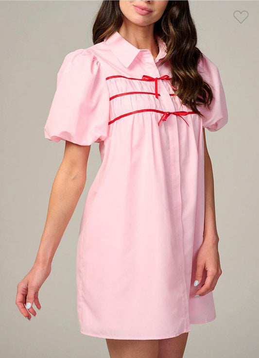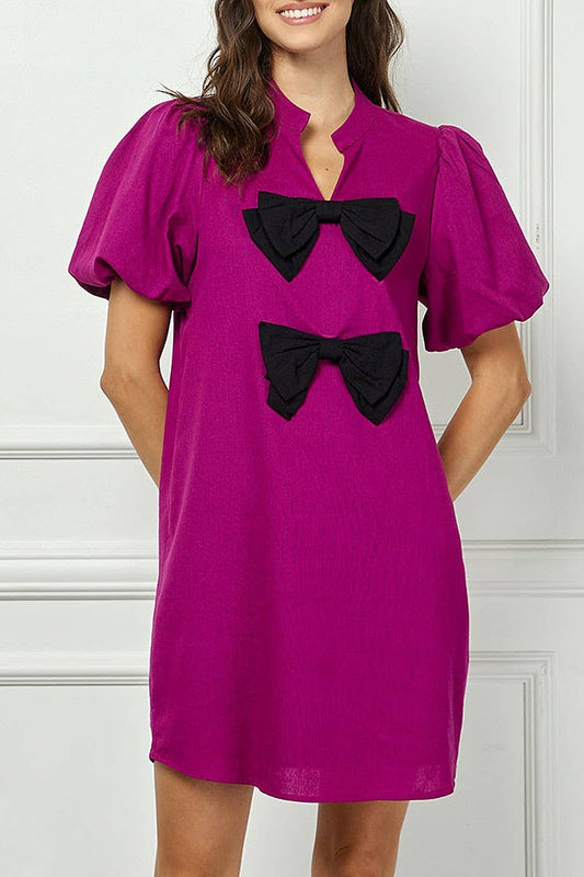 BOWNITA BUBBLE SLEEVES BOW DETAILED SHIFT MINI DRESS