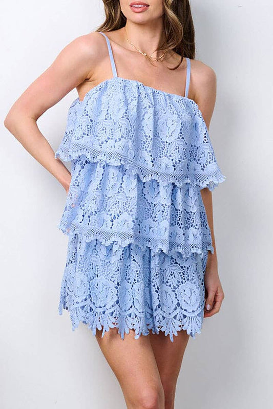 SLEEVELESS RUFFLE CROCHET FLORAL TIERED MINI DRESS by is