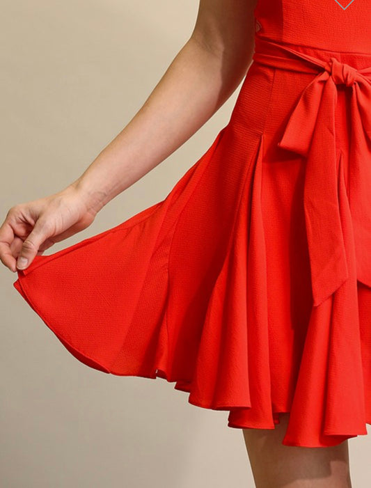 V-Neck Bubble Sleeve Ruffle Waist Tie Strap Lace Dress