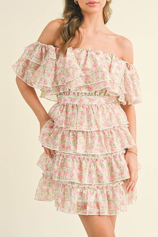 MONICA OFF SHOULDER TIERED RUFFLE FLORAL MINI DRESS