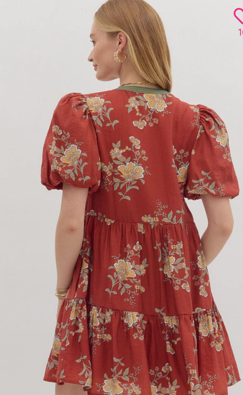 Floral print short puff sleeve mini dress featuring contrast binding V-neck with visible topstitch detail. Side pockets. Lined. Woven. Non-sheer. Lightweight.