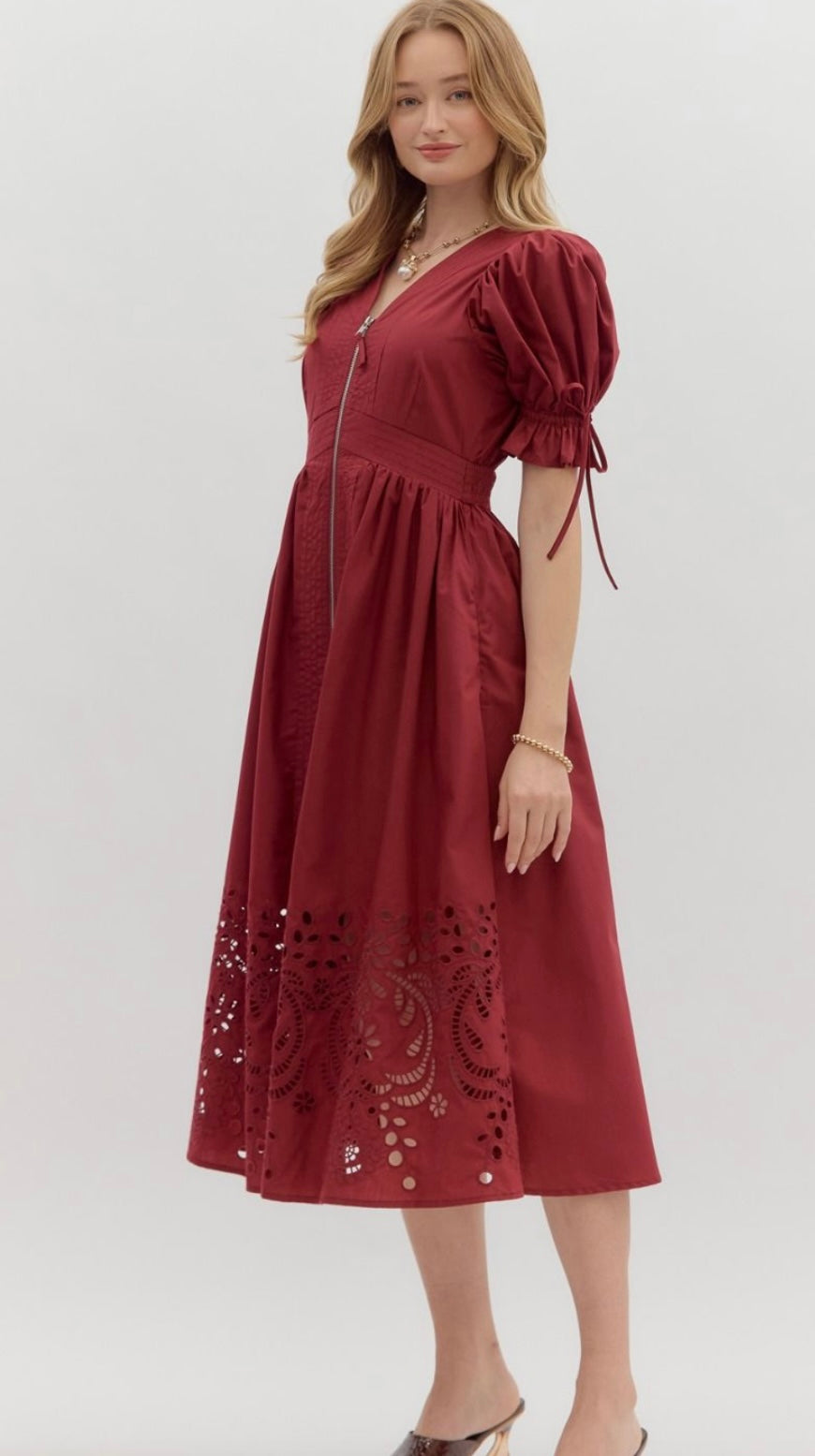 Solid short puff sleeve midi dress featuring stitch accent V-neck and waistband and embroidered skirt hem. Zipper front closure with smocked waistband at back. Lined. Woven. Non-sheer. Lightweight