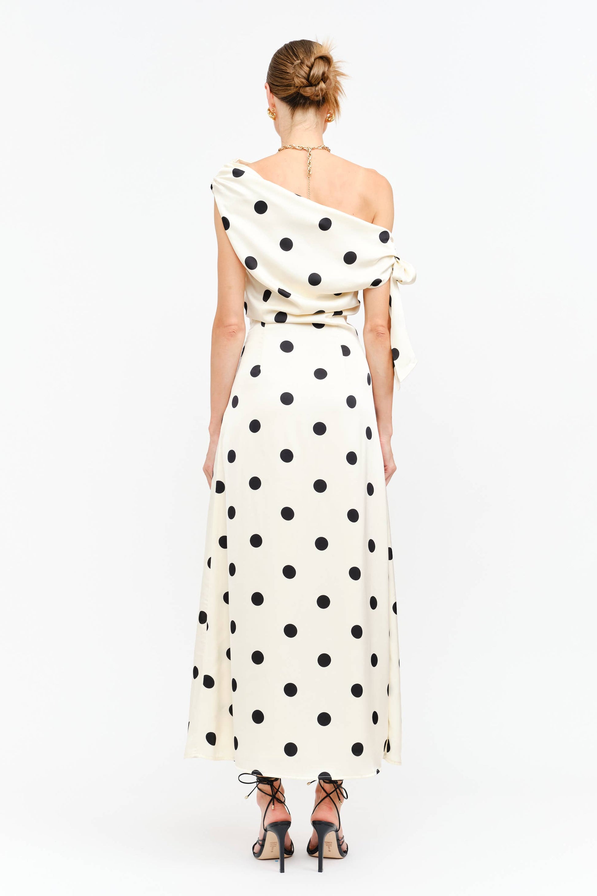 Vintage charm meets modern elegance in this statement-making one-shoulder midi. With its playful polka dot print, asymmetric neckline, and oversized shoulder tie, this silky silhouette is made for twirling at garden parties, rooftop soirées, or anywhere the champagne’s flowing.