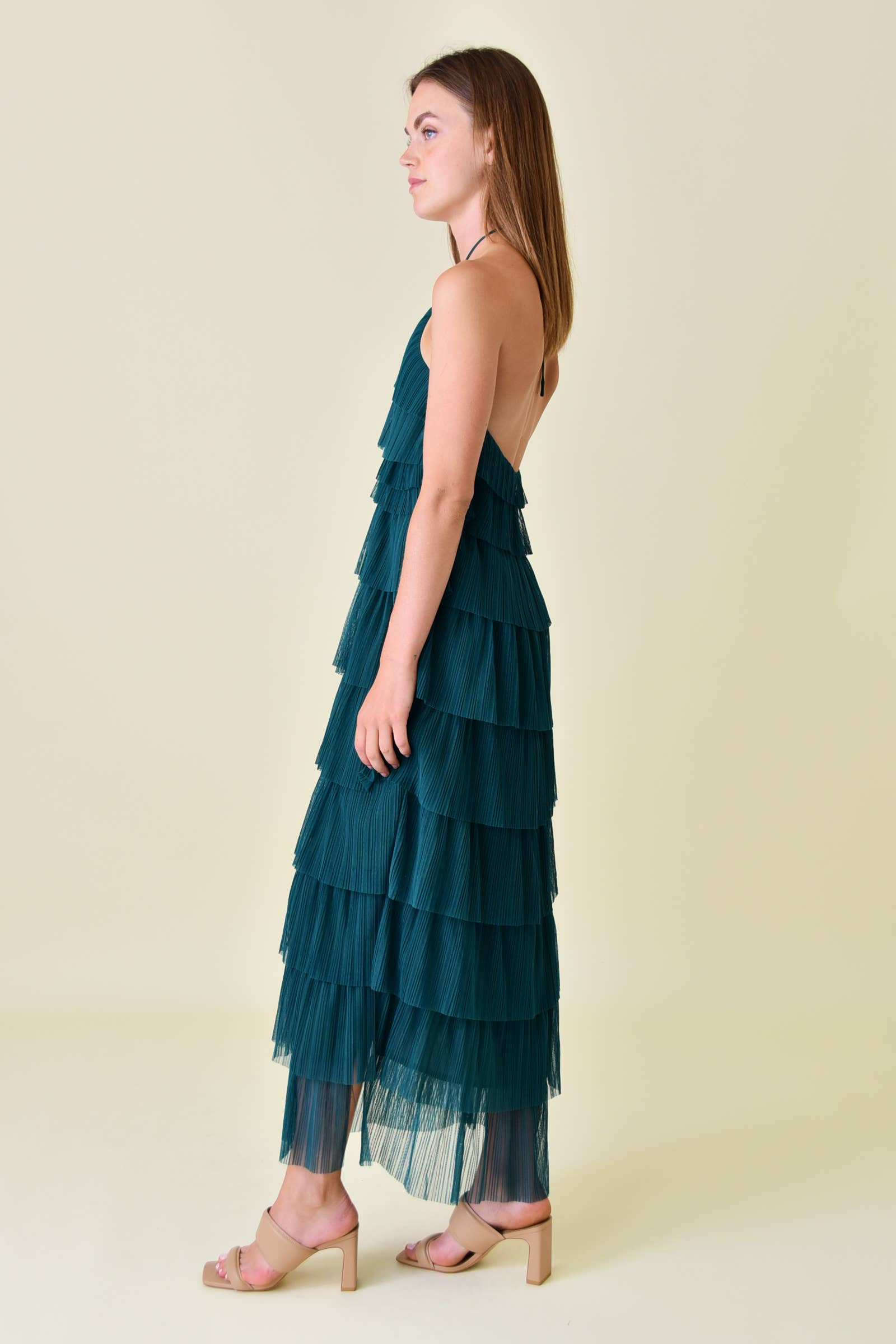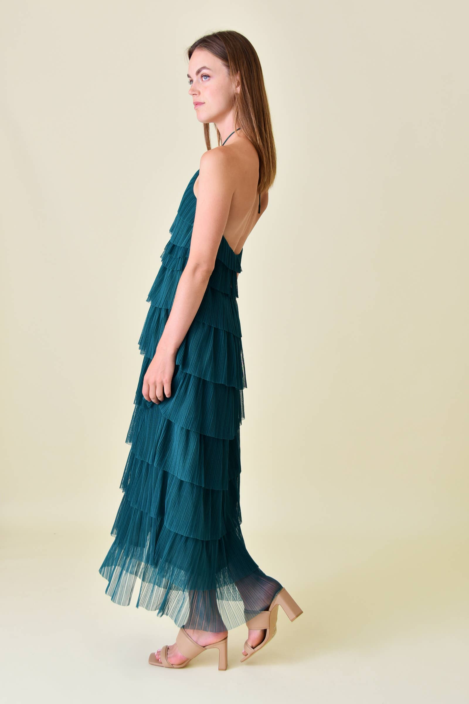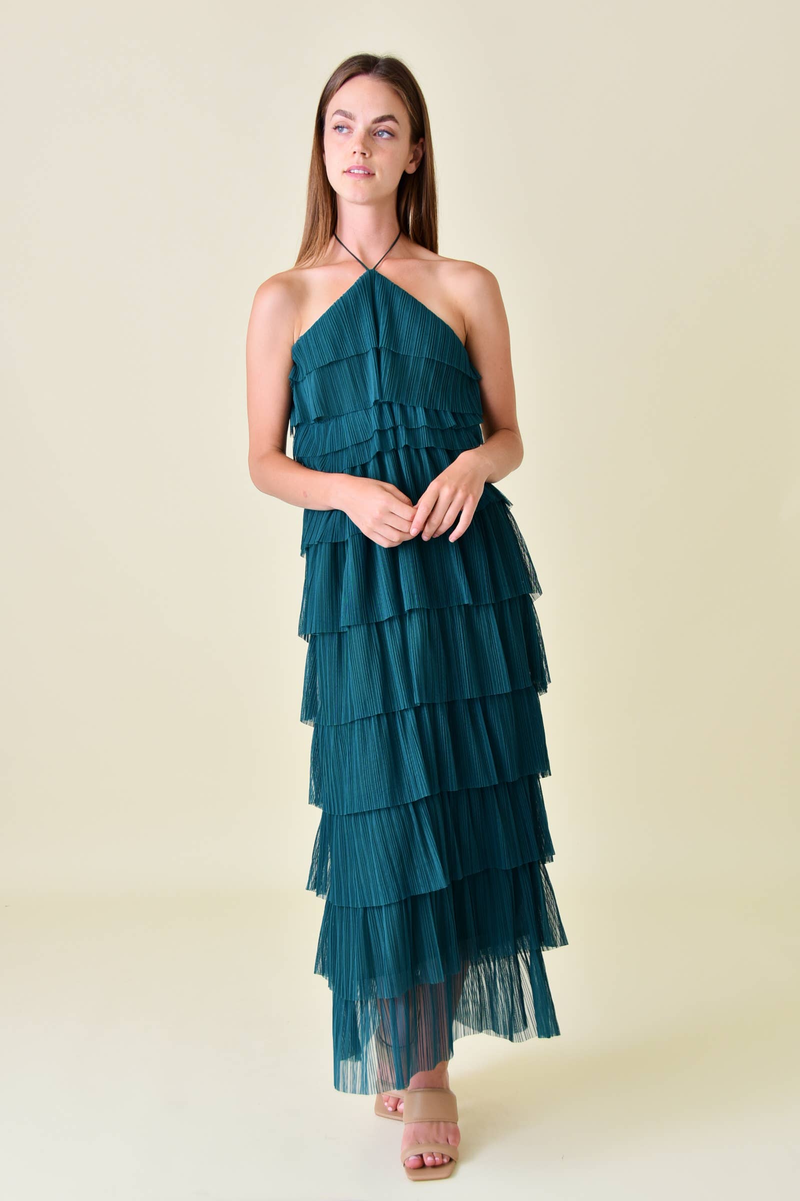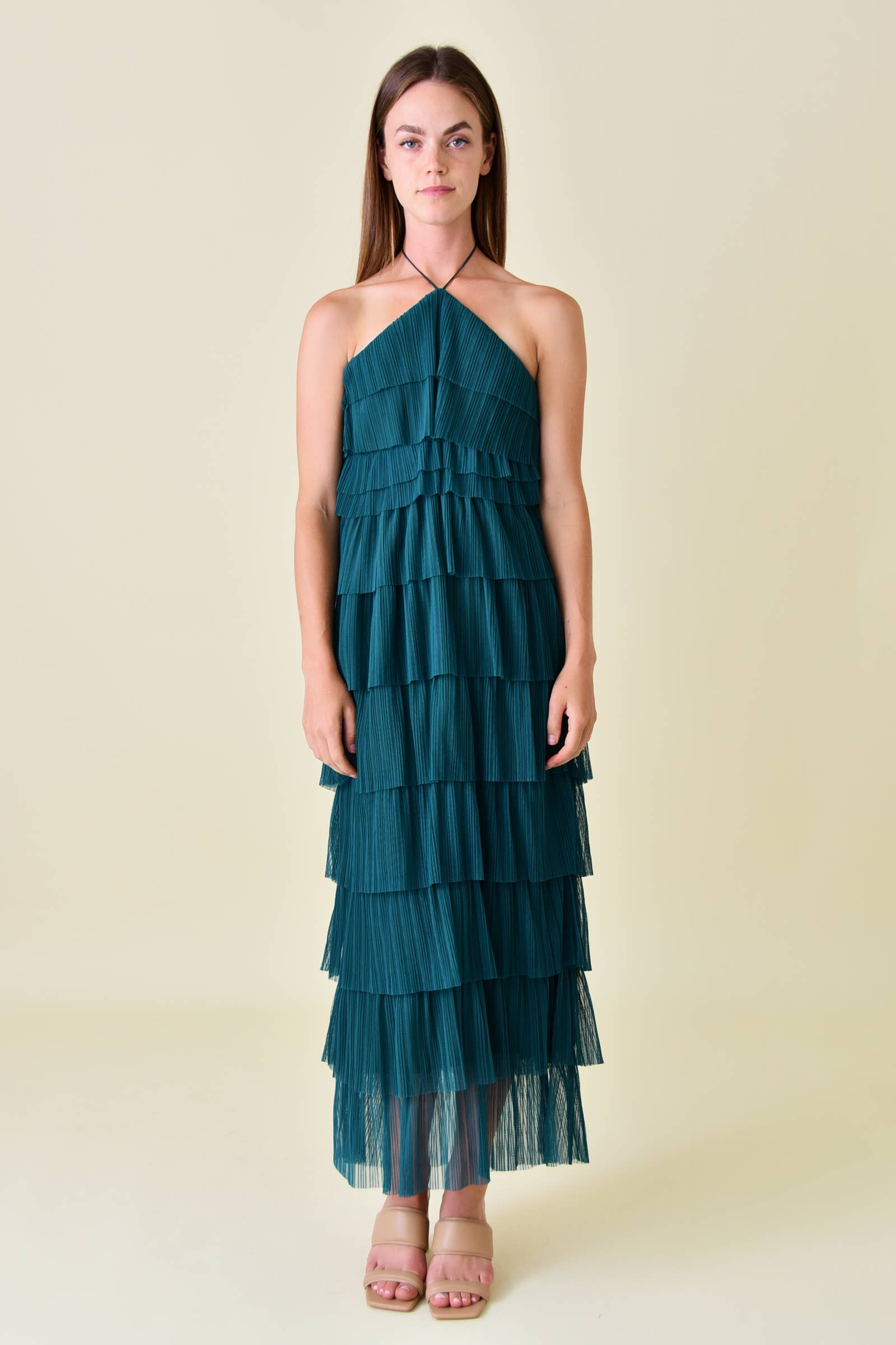 HALTER NECK TIERED PLEATED MESH MAXI LENGTH OPEN BACK KEYWORDS: SPRING DRESS, SUMMER DRESS, SUNDRESS, GARDEN PARTY DRESS, DERBY DAY DRESS, PINK DRESS, CREAM DRESS, DRESSY DRESS, VACATION DRESS, RESORT DRESS